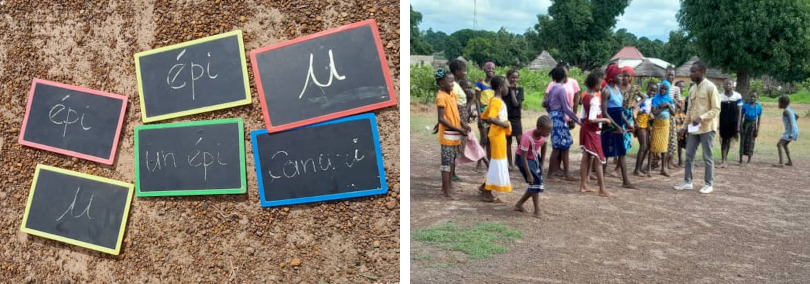 Und am Nachmittag geht das Lernen mit sportlichen Aktivitäten oder spielerischen Spielen weiter, um das am Morgen Gelernte zu festigen. Eine Vielzahl von Aktivitäten wie Wettrennen, um das richtige Wort zu finden, Ballwerfen zum Rechnen, Ausmalen und natürlich das tägliche Lesen von afrikanischen Märchen.