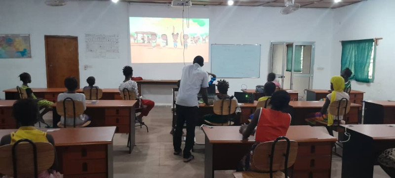 Anschauen von Zeichentrickfilmen und afrikanischen Märchen am späten Nachmittag im Computerraum. In dieser Sitzung geht es zunächst darum, zuzuhören und zu verstehen. Dann beantworten sie Fragen und eignen sich nach und nach die Geschichte an, indem sie den Inhalt mit ihrem eigenen Vokabular nacherzählen.