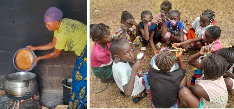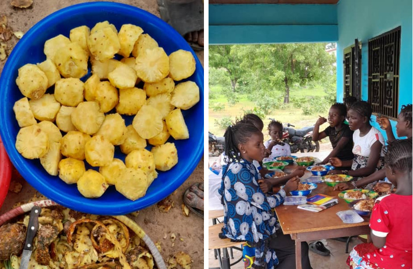 Ähnlich wie in einem Ferienlager und vor allem, um gut zu lernen, gibt es nichts Besseres als einen vollen Bauch. Sie nehmen ihre Mahlzeiten morgens, mittags und abends gemeinsam ein. Um dieses Camp zu bereichern, haben wir Baguette, gesüßte Kondensmilch und Brotaufstrich am Morgen, Sardinen und hartgekochte Eier, um die Eintönigkeit von Reis und Soße am Mittag zu durchbrechen, und Brei für das Abendessen vorgesehen. Natürlich gibt es auch Erdnüsse und Obst der Saison für die Pausen nach zehn und vier Stunden!