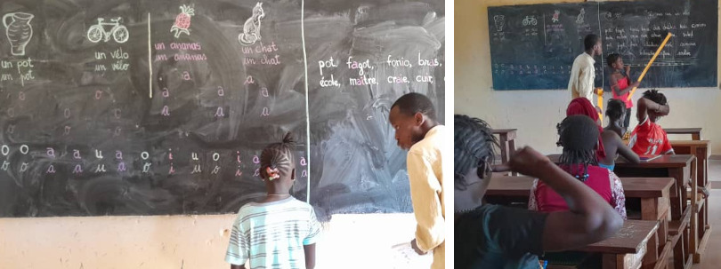 Je nach Niveau unserer 26 Mädchen, die in unserem Grundschulprogramm verblieben waren, wurden sie in kleine Gruppen eingeteilt und auf verschiedene Klassenräume des Collège verteilt, das normalerweise während der großen Ferien geschlossen ist, um die fehlenden Grundlagen zu lernen und sie in ihrem eigenen Tempo vertiefen zu können.