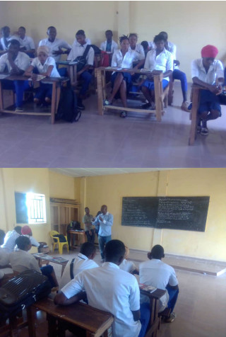 Herr Grovogui und seine motivierten Schülerinnen und SchülerHerr Tanou Grovogui, ein Absolvent der Universität Kankan im Fach Biologie, Jahrgang 2020, unabhängiger Forscher und leidenschaftlicher Immunologe, wurde gerade nach Fodecariah versetzt, um Biologie und Geologie in der Sekundarschule zu unterrichten.