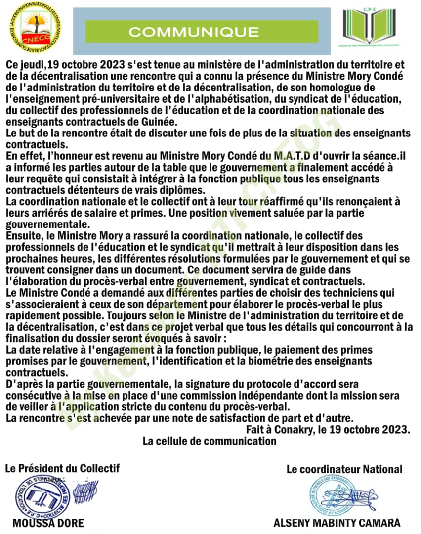 Guinea ist von diesen Turbulenzen nicht ausgenommen und die 18.600 Vertragslehrer, die seit sehr langer Zeit misshandelt werden, sehen immer noch kein Ende ihrer Misere. Ohne gute, motivierte und gut bezahlte Lehrer ist es fast unmöglich, die Zukunft eines Landes vorzubereiten.