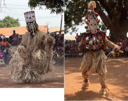 Bei dieser Zeremonie habe ich zum ersten Mal eine Frau in der Bruderschaft der Jäger entdeckt, die Musikerin und Sängerin ist. Die Masken haben zwei Hexen, die "Mange Tout"-Hexe mit lila Haaren und die Hexe, die sich nicht in der Gesellschaft zu benehmen weiß.